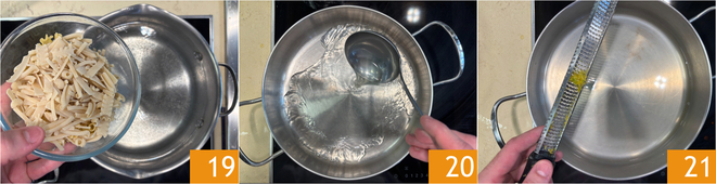 At this point, cook the pasta in plenty of salted water 19; cook 3-4 minutes less than the time indicated on the package. Meanwhile, prepare the base for the pasta: in a saucepan, pour a few ladles of vegetable broth 20, then flavor with grated lemon zest 21.