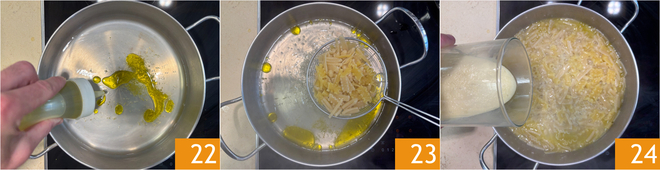 Add the oil 22 and bring to a boil. Drain the pasta and transfer it to the saucepan 23, then add the potato cream 34.
