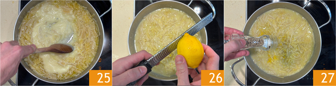 Stir and finish cooking the pasta 25. At the end of cooking, on low heat, add the lemon zest 26 and a dash of white pepper 27.
