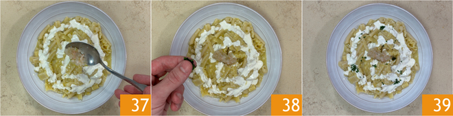 Place another teaspoon of scampi tartare on the pasta 37 and finish with chopped parsley 38. Your pasta with potatoes and scampi is ready to be served 39!