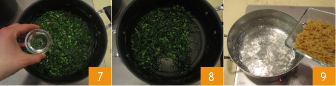 Add a couple of tablespoons of water 7 and let them cook for about 10/15 minutes at most, stirring often, until well softened 8. Then cook the pasta in plenty of boiling water, salted to taste 9; drain it al dente and let it cool slightly.