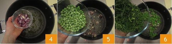 Pour a drizzle of oil into a saucepan, add the chopped onion 4 and let it soften. Add the peas 5, the agretti 6, and season with salt and pepper.