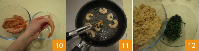 Shell the prawns 10 and if necessary, remove the black thread found on the back. In a pan, heat a drizzle of oil and use it to sear the prawns over high heat. It will take about a couple of minutes, and you should turn them halfway through cooking 11. Allow the prawns to cool slightly, then cut them in half. Pour the agretti-based dressing into a bowl, add the now lukewarm pasta 12.