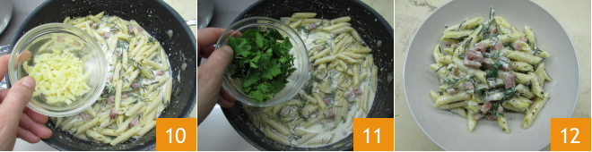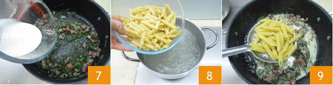 At the end of cooking, pour in the cream 7. You have time to cook the pasta; dip it in the water 8, and when it's al dente, drain it directly into the sauce 9.