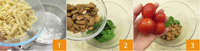 To prepare the pasta with arugula pesto and tuna, start by putting the water on the stove to cook the fusilli. When it comes to a boil, salt it and cook the pasta 1. In the meantime, prepare the pesto. In the bowl of a blender, add the arugula, a few basil leaves, the almonds 2, and the tomatoes 3