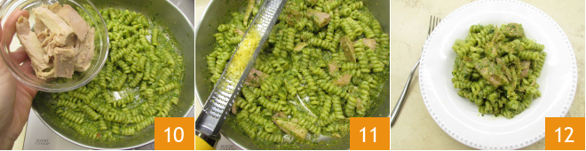 Now add the drained tuna fillets 10 and grated lemon zest 11. Give it a final stir before plating and enjoy your pasta with arugula pesto and tuna right away 12.