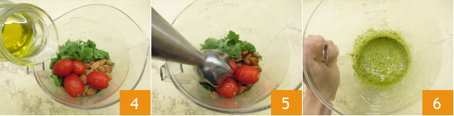 then the oil 4 and finally the salt. Now blend everything 5 until you get a smooth and homogeneous cream 6.
