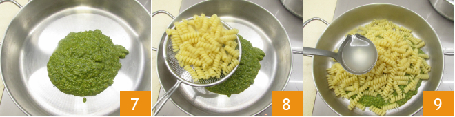 Pour the pesto into a pan without turning on the stove 7 and as soon as the pasta is al dente, drain it directly into the pan 8. Add a ladle of pasta cooking water to thin the mixture and combine 9.