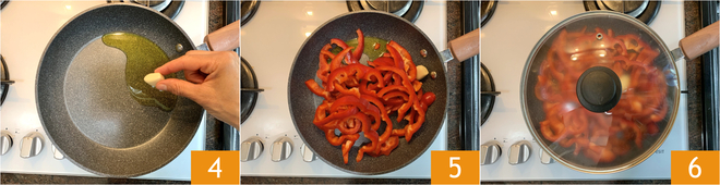 In a pan, heat a drizzle of olive oil with a clove of garlic for 2-3 minutes over low heat 4. Add the bell peppers and cherry tomatoes 5, salt, cover with a lid 6, and cook for 10 minutes. Place a pot full of salted water on the stove and bring it to a boil.