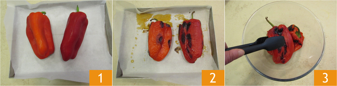 To prepare pasta with bell pepper and Taleggio cream, first wash the bell peppers. Place them on a baking tray lined with parchment paper and bake in a hot oven at 430°F for 30-35 minutes 1. After about 20 minutes, turn the bell peppers. Once ready 2, transfer them to a bowl 3.