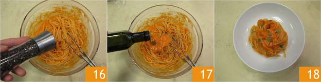 Add pepper 16 and a drizzle of olive oil 17. Serve the pasta with bell pepper and Taleggio cream hot 18.