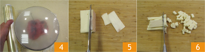 Cover with plastic wrap and set aside to cool slightly, this step will make it easier to peel off the skin. Put a pot of water on to boil for cooking the pasta, and salt it once it boils. Cut the Taleggio D.O.P. into slices 5 and then into small cubes 6.