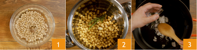 To prepare pasta with chickpeas and potatoes, start by soaking the legumes. Chickpeas need to be rehydrated in fresh water for 34 hours 1. You can also follow the instructions on the package, but the longer you soak them, the more tender their skin will be. The next day, drain and rinse them, and place them in a pot with garlic and rosemary. Cover with water and let simmer for a couple of hours 2. Prepare the Vegetable broth, which you should keep warm. Then clean the shallot and slice it thinly 3.