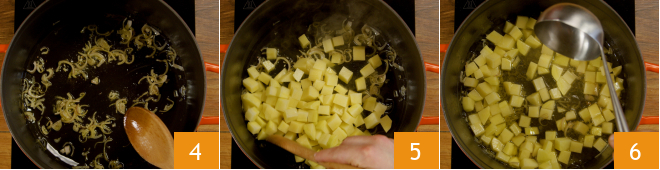 Let it braise in the oil 4, and in the meantime, slice and dice the potatoes. Then add them to the saucepan and sear 5 them before moistening with vegetable broth and cooking for 10 minutes 6.