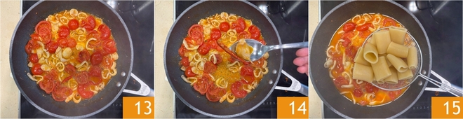 Pour a ladle of water 10, cover with a lid 11, and continue cooking for about 15 minutes, until the cherry tomatoes have released part of their juice. In the meantime, cook the paccheri al dente in abundant salted water 12.