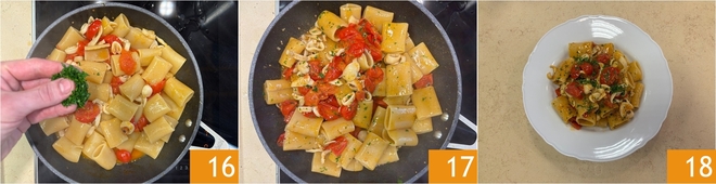 After this time, the sauce will be ready 13, remove the garlic clove and the chili peppers 14, then drain the paccheri directly into the pan 15.