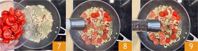Add the halved cherry tomatoes 7, adjust with salt 8 and pepper 9.