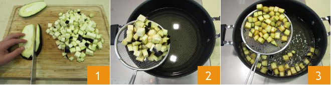 To make the mezze maniche with eggplants and Grana Padano wafers, first wash and dry the eggplants, then cut them first into thick slices and then into sticks, then reduce them to cubes of about 1 cm 1. Place a pan with seed oil on the stove and heat it to 338°F, fry the eggplants for a couple of minutes or until they are golden, then drain them with a slotted spoon 3.