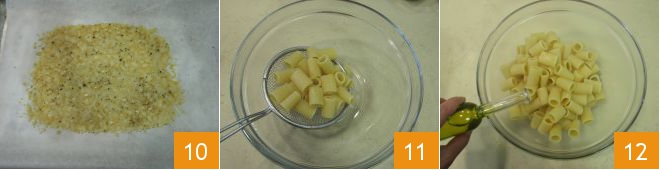 Take your Grana Padano PDO wafer out of the oven 10 and let it cool slightly. As soon as the pasta is ready, drain it into a large bowl 11 and season it with olive oil 12.