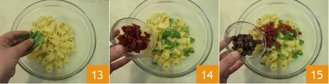 Flavor with fresh basil leaves 13, well-drained sun-dried tomatoes in oil 14, and olives 15.