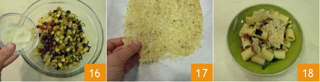 Incorporate the fried eggplants and flavor with a tablespoon of grated Grana Padano PDO 16. Take the wafer and break it to obtain coarse pieces 17. Garnish the pasta with the Grana Padano PDO flakes and enjoy it lukewarm 18.