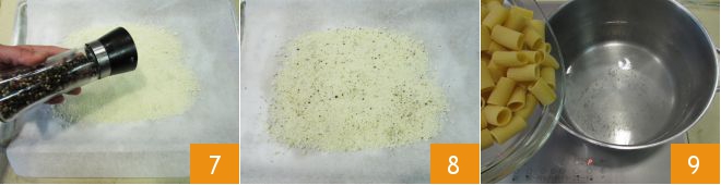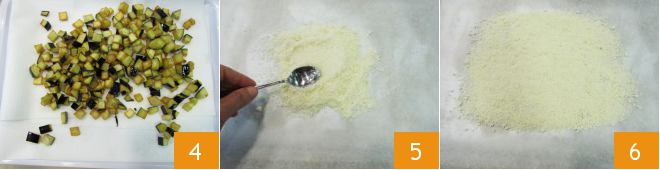 Place the fried eggplants on a tray lined with absorbent paper to dry the excess oil 4. Meanwhile, place a pot filled with water on the stove and bring to a boil, it will be used for cooking the pasta. Line a baking sheet with parchment paper and distribute 2 oz of grated Grana Padano PDO with a teaspoon 5 to create an even layer 6.