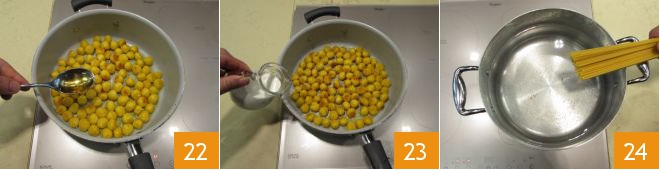Deglaze with brandy 22 and let it evaporate. Then add the fresh liquid cream 23, seasoning with salt and pepper. Let it cook this way for about 10 minutes on medium heat. In the meantime, boil the spaghetti 34,