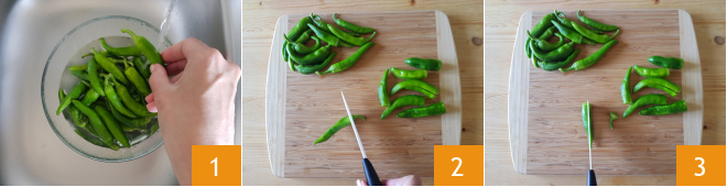To prepare friggitelli and sausage pasta, start by rinsing the friggitelli under running water 1, then clean them by removing the stem 2 and slicing them lengthwise 3.
