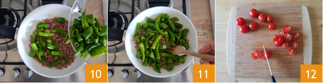 At this point, add the friggitelli 10 and cook for a few minutes while stirring occasionally 11. In the meantime, you can clean the cherry tomatoes and cut them into 4 parts 12.