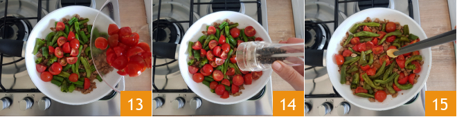 Also add the cherry tomatoes 13, adjust with salt and pepper 14, then cook over low heat for 10-15 minutes; at the end, remove the garlic 15.