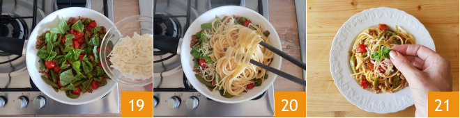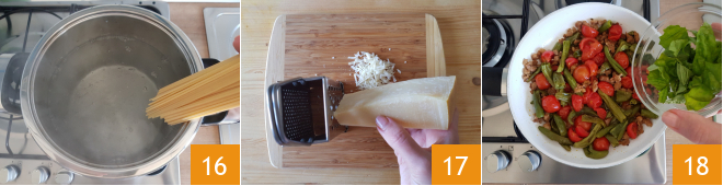 At this point, throw the pasta into boiling salted water and make sure to drain it al dente 16. Meanwhile, you can grate the cheese 17 and choose the basil leaves to clean and tear by hand. Once the sauce is ready, turn off the heat and add the basil 18.