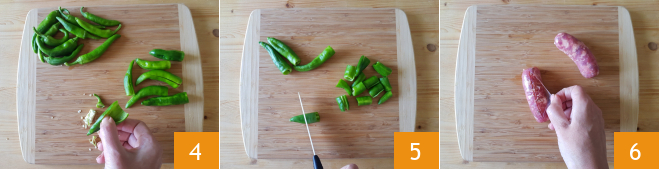 Remove the seeds inside 4 and set aside the smaller friggitelli while you can cut the larger ones 5. Take the sausages and remove the casing 6.