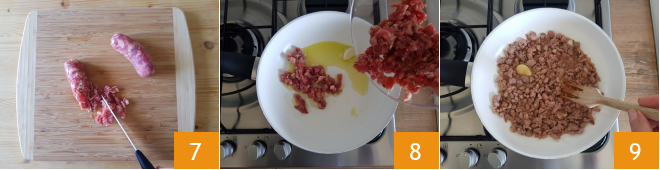 Crumb them or chop them with a knife 7 and move to the stove. Heat a drizzle of oil in a pan, add the sausage 8 and let it brown over low heat until golden, stirring occasionally 9.