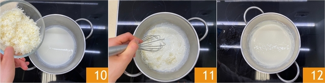 In another pot, heat the cream to about 122-131°F. Once at temperature, turn off the heat and add the grated cheeses 10, then mix with a whisk 11 until you obtain a smooth and homogeneous fondue 12.