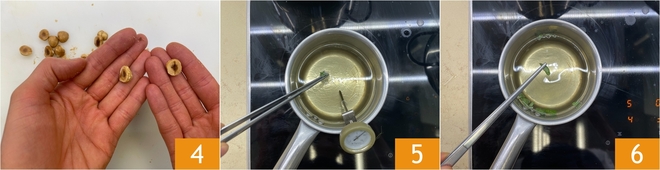 Once toasted, let the hazelnuts cool slightly and chop them coarsely with a knife 4. Heat the sunflower oil in a saucepan until it reaches a temperature of about 320-340°F. Fry a few sage leaves at a time 5 for a few seconds, until they are crispy 6.