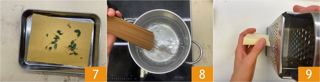 Drain the sage on absorbent paper 7. Meanwhile, cook the spaghetti in plenty of salted water 8. Grate the toma cheese 9.