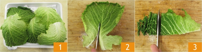 To prepare pasta with lard, cabbage, and potatoes, first remove the outer tough leaves of the cabbage, wash under running water, and dry with a cloth 1. Remove the central rib 2 and cut the leaves into strips of about 0.4 inches 3. Set aside 1.8 oz for decoration.
