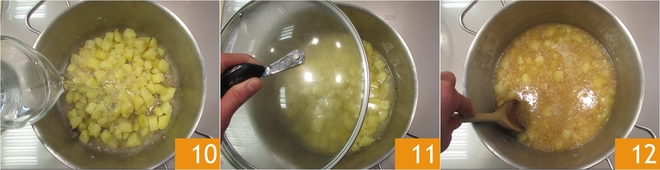 At this point, cover with water to the brim 10, lower the heat, and cook for 10 minutes with the lid on 11. When the potatoes are almost cooked, mash them coarsely with the back of a spoon 12.