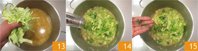 Now add the cabbage 13, salt, pepper 14, and season with rosemary 15.