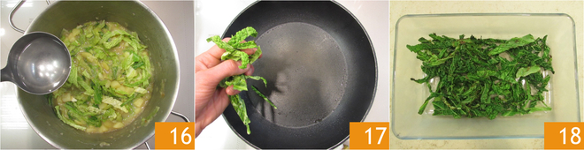 Add about 2 cups of water 16 and cook for another 10 minutes. Bring a pot of water to a boil, which you will use later. In the meantime, sauté the 1.8 oz of cabbage in a non-stick pan with a drizzle of oil 17 until crispy, then set aside 18.
