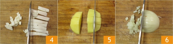 Dice the lard 4, then peel the potatoes and cut them into 0.4-inch cubes 5. Finally, peel the onion and chop it finely 6.
