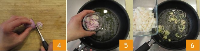 Slice the shallot into thin rings 4 and let them sauté in a pan with a drizzle of oil 5. As soon as it is well browned, add the squid cubes 6 and sauté for a few moments.