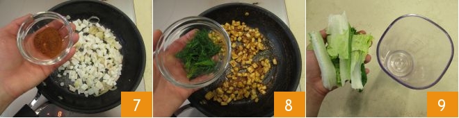 Add the sweet paprika 7 and cook for a couple more minutes. Then turn off the heat and add the sprigs of wild fennel 8. Set the squid aside and prepare the lettuce pesto. Wash, dry, and cut the lettuce into pieces, then transfer it into a blender cup 9.