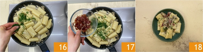 Drain them al dente and transfer them to the pan with the mushrooms 13; add a ladle of cooking water 14 and the stracchino 15.