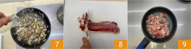 When the mushrooms' water has evaporated, deglaze with white wine 7 and cook for a few more minutes. Meanwhile, cut the speck into strips 8 and place it in a small pan 9.