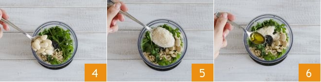 the almonds 4 and the grated Parmesan 5. Add a teaspoon of extra virgin olive oil taken from the total amount 6 and pulse the blades several times.