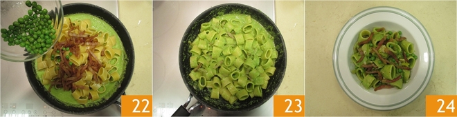 Add the remaining peas 22 and sauté the pasta for a couple of minutes over medium heat 23. Plate it and decorate with the crispy guanciale 34, then serve immediately!