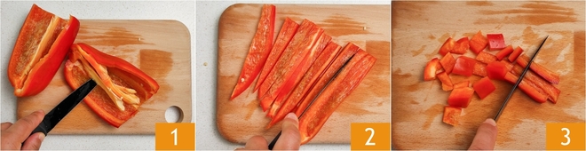 To make pasta with peppers and tuna, first, put a pot with plenty of water on the stove, salt it, and bring it to boil to cook the pasta. Meanwhile, cut the pepper in half and remove seeds and inner filaments 1. Slice the pepper lengthwise 2 and then into chunks 3.