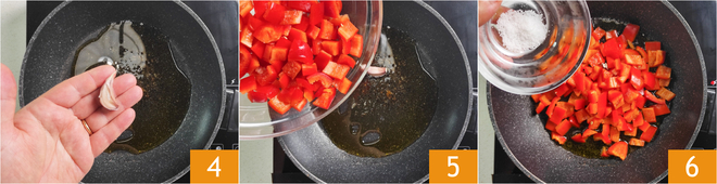 Sauté the unpeeled garlic clove in a pan with a drizzle of oil 4, then add the peppers 5 and salt 6. Cook on low heat for about 10 minutes or until you reach the desired consistency, stirring occasionally. If necessary, you can add a couple of tablespoons of the pasta cooking water.