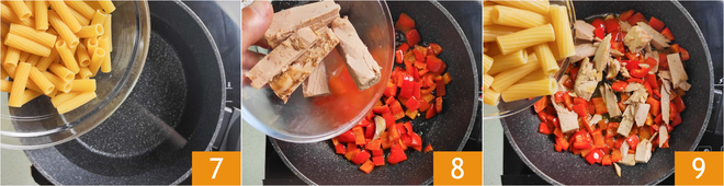 Meanwhile, plunge the pasta into the boiling water and cook for the time indicated on the package 7. After the pepper cooking time, remove the garlic, add the drained tuna 8, and sauté everything for 2 minutes. Drain the pasta al dente and transfer it directly to the pan 9.